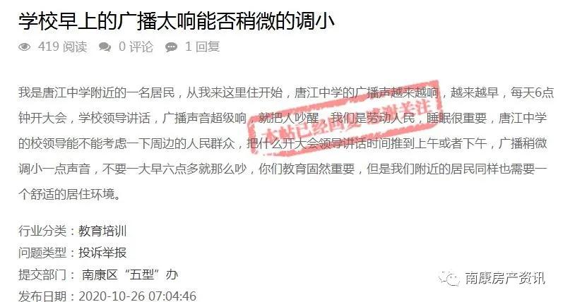 您好!反映“唐江中学每天早上开广播太响”的问题已收悉,经南康区教科体局核实处理,现回复如下: