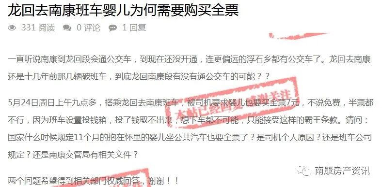 您好!您反映的“龙回南康路段班车婴儿乘车是否可以收全票费用”的问题已收悉。我区高度重视,经区交通运输局调查核实,现回复如下:一、关于“开通南康到龙回段公交车”问题南康区委区政府一直以来都十分重视开通城乡公交这一民生问题,计划按“先近后远”的原则,逐步开通城区至乡镇公交车,区交通运输局也做了大量的前期工作。2018年以来,全国出城公交(城乡公交)发生了多起重大事故,随后中央、省、市、区均相继出台了关于加强出城公交运行安全管理的文件,明确要求在审批开通城乡公交环节须从严把关,尤其是对车流量大,途经国省道的线路更是要慎之又慎。南康区交通运输局在征求公安交管、城乡规划等部门的意见时,交管部门明确表示城区至龙回暂时不适宜开通公交车辆,同时下达了关于3路公交(城区—浮石)必须整改的通知书,要求实行1人1座的农村客运班线模式。综上所述,鉴于公交路线安全管理、资金投入等多方面的综合考虑,目前开通城区至龙回公交线路的条件暂时还不成熟,待道路通运安全设施、区财力等条件成熟后,区交通运输局将积极推动重新启动开通城乡公交计划。二、关于“龙回南康路段班车婴儿乘车是否可以收全票费用”问题关于您反映“5月24日周日上午九点多,搭乘龙回去南康班车,被司机要求婴儿也要买全票”问题,南康区交通运输局立即派出工作小组到运营龙回-南康班线的康兴客运公司(私营企业)调查核实,经调查核实,您反映的“被司机要求婴儿也要买全票”问题属实。处理结果:一是责令康兴公司退还票款(5月27日已退还),并赔礼道歉。二是下达整治通知书,责成康兴客运公司进行业务整治,对所有司乘人员进行教育培训,杜绝违法违规行为发生。下一步,南康区交通运输局将坚持把老百姓出行问题放在首位,继续对该事项进行追踪落实,举一反三加强农村班线营运情况的日常监管,进一步加大督查检查力度,努力提高农村班线服务水平,营造安全、舒心的交通出行环境。感谢您对南康区交通运输局工作的信任、理解和支持。2020年6月1日根据回复开通城区至龙回公交线路的条件暂时还不成熟,也不知道何时才能开通,只能等啊等,对于婴儿乘车被收票钱你有遇到类似的情况吗?大家对此怎么看?欢迎文末留言讨论~