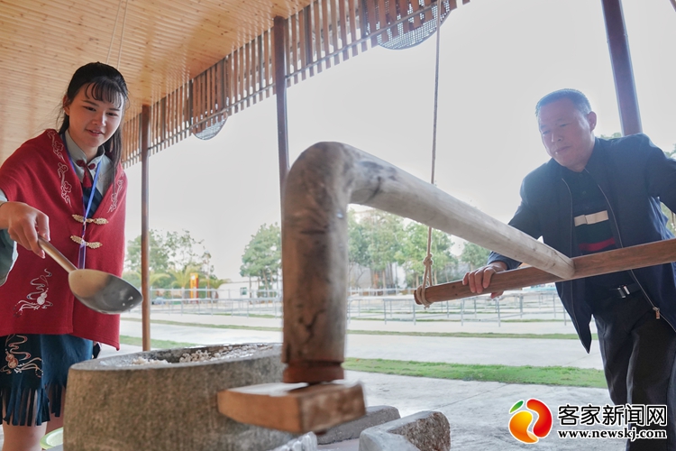 游客在体验用石磨把稻米磨成米浆。