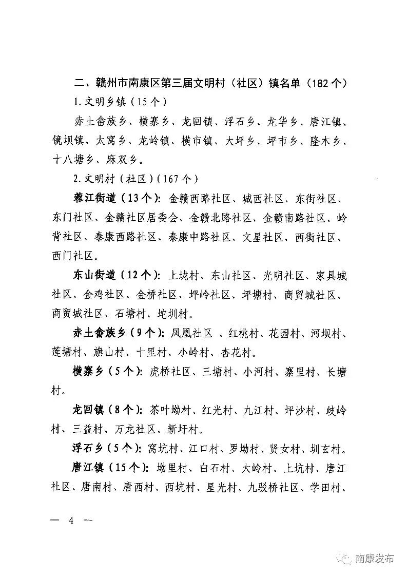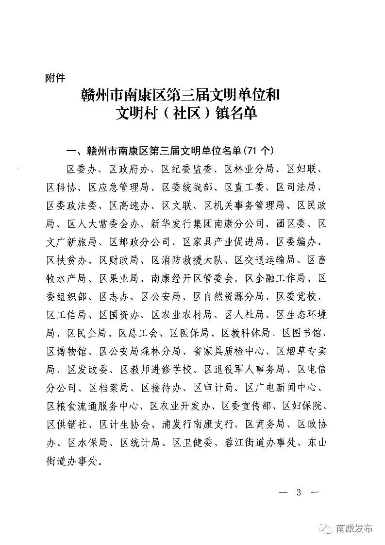 为充分展示全区精神文明创建活动的成果,鼓励全区广大干部群众更加奋发进取,进一步推动群众性精神文明创建活动广泛深入开展,区委、区政府决定授予区委办公室等71个单位“赣州市南康区第三届文明单位”称号,授予赤土畲族乡等182个村(社区)镇“赣州市南康区第三届文明村(社区)镇”称号。