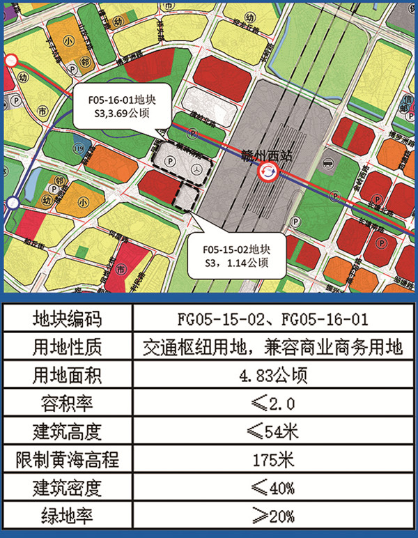依据《赣州市凤岗片区控制性详细规划》FG05-15-02、FG05-16-01地块规划建设汽车客运站和旅游集散中心,因控规未明确地块容积率、建筑密度等规划指标,为高标准、高品质指导项目建设,集约节约用地,2020年9月28日,赣州市自然资源局组织召开了《赣州市凤岗片区控制性详细规划FG05-15-02、FG05-16-01地块概念性规划方案设计及规划指标论证报告(高铁旅游集散中心项目)》专家论证会,对地块指标和综合开发利用的合理性进行论证。规划论证提出在原有功能不减少、品质不下降的前提下,应对FG05-15-02、FG05-16-01地块进行综合开发利用,用地性质为交通枢纽用地兼容商业商务用地,容积率≤2.0,建筑高度≤54米,建筑密度≤40%,绿地率≥20%。