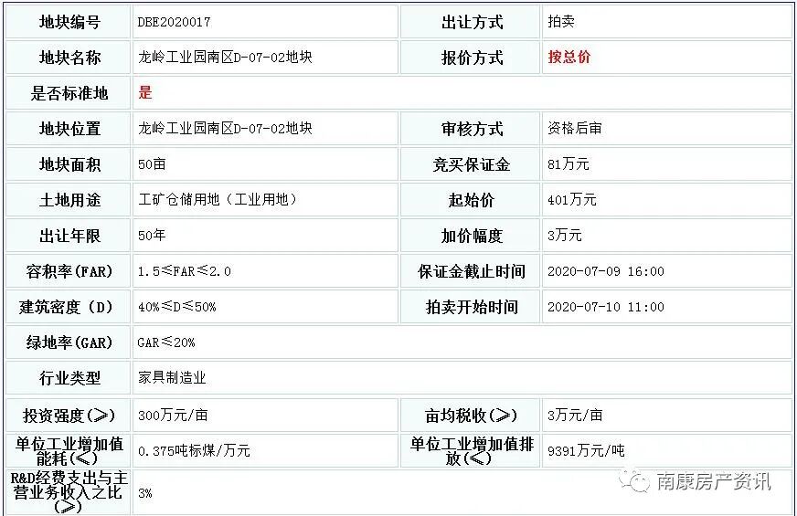 值得注意的是:该宗地采取“标准地+承诺制”方式供应,准入行业为家具制造业,固定资产投资强度≥300万元/亩,亩均税收≥3万元/亩,单位能耗工业增加值≤0.375吨标煤/万元,单位水耗工业增加值133立方米/万元,单位排放增加值≥9391万元/吨,R&D经费支出与主营业务收入之比(%)≥3%