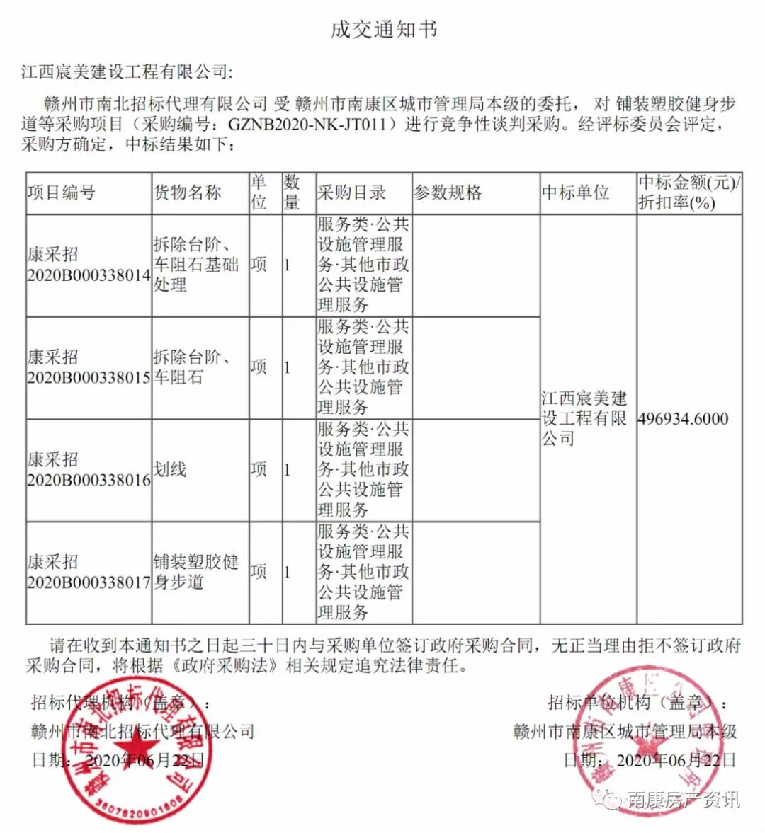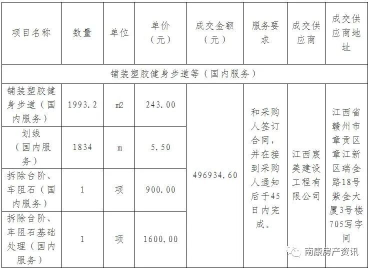 南康区公园管理所铺装塑胶健身步道等项目包含铺装塑胶健身步道(国内服务)、划线(国内服务)、拆除台阶、车阻石(国内服务)、拆除台阶、车阻石基础处理(国内服务),成交金额496934.60元。