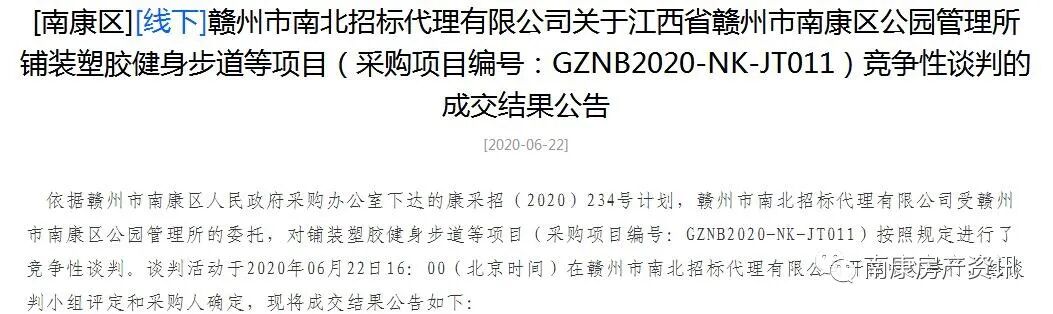 近日,江西省公共资源交易网发布了关于江西省赣州市南康区公园管理所铺装塑胶健身步道等项目(采购项目编号:GZNB2020-NK-JT011)竞争性谈判的成交结果公告,如下:
