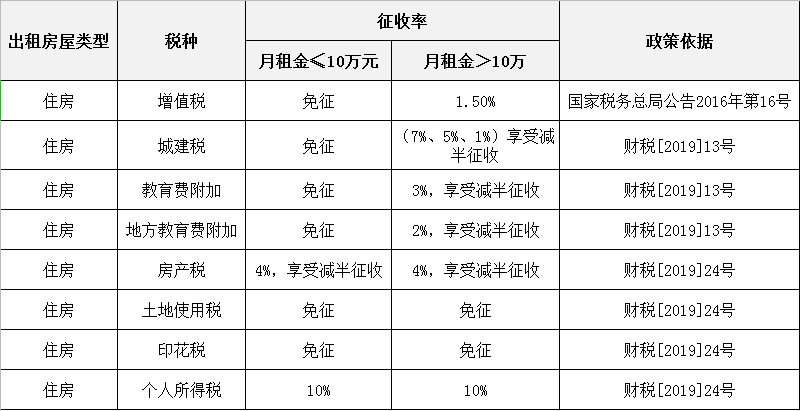 云南省政府2017年2月发布《关于加快培育和发展住房租赁市场的实施意见》,其中指出,个人出租住房,应按照5%的征收率减按1.5%计算缴纳的增值税。月租低于3万元的,自2016年5月1日起至2017年12月31日,可享受小微企业暂免征收增值税优惠政策。对一般纳税人出租在2016年取得的不动产,允许选择适用简易计税办法,按照5%的征收率计算缴纳增值税;对个人出租住房所得,减半征收个人所得税。