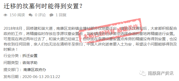 网友留言:2018年8月,因修建和谐大道,南康区龙岭镇金塘村部分坟地要迁出,接到迁坟通知后,大家都积极配合政府的工作,将精罐临时存放在李源坟墓安置点,龙岭镇政府也承诺会选择合适的墓地将精罐进行安置。可是现在将近两年过去了,和谐大道已经竣工,但存放在李源坟墓安置点库房的精罐没有得到安置,也没有收到任何回音,亲人们也无法在清明冬至祭扫,中国人讲究逝者要入土为安,希望这个问题能够得到及时解决!