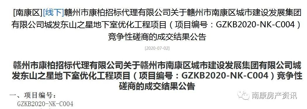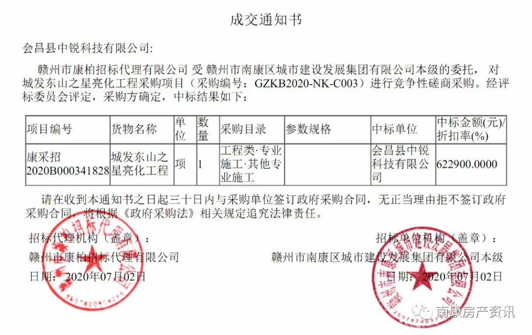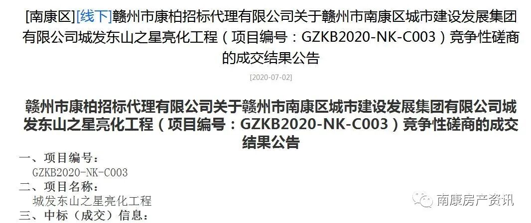 近日,江西省公共资源交易网发布了关于南康区城市建设发展集团有限公司城发东山之星亮化工程和地下室优化工程项目竞争性磋商的成交结果公告,如下:
