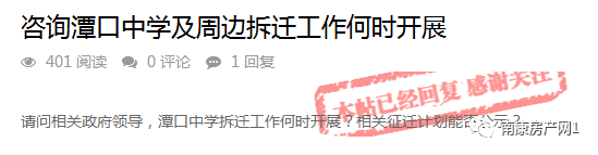 近日,有网友在“问政”平台咨询咨询潭口中学及周边拆迁工作何时开展,相关部门给到了回复。一起来看下~