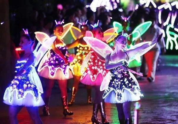 荧光女郎巡游热舞、七彩荧光现场欢乐海洋, 打造一个充满生机、乐趣与互动情境的营地氛围。