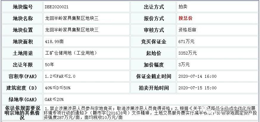 值得注意的是:1.禁止涉黑涉恶人员参与宗地竞买;取消涉黑涉恶人员竞得资格;2.根据《关于开展降低企业成本优化发展环境专项行动的通知》(赣市字[2016]8号)文件精神,土地交易服务费实行减半收取;3.该宗地固定资产投资强度287万元/亩,亩均税收10万元/亩