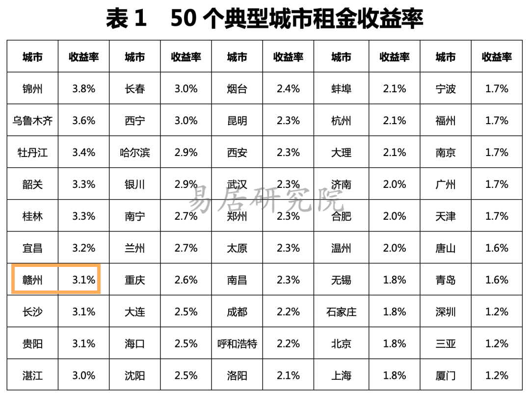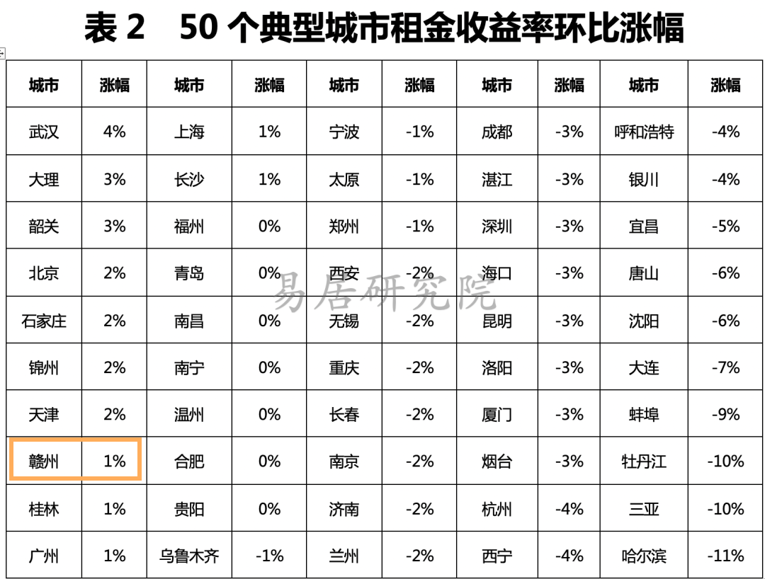 其中,赣州的租金收益率环比涨幅为1%,位居50个典型城市第8位。