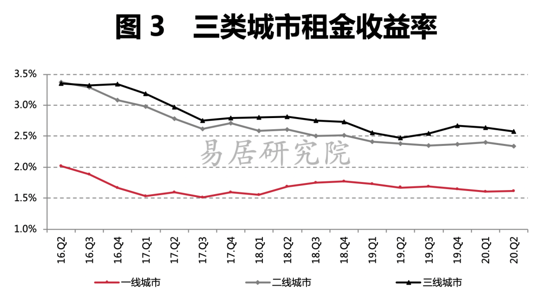 根据易居研究院的数据显示,2020年二季度,4个一线城市的平均租金收益率为1.6%,环比持平,同比下降4%;