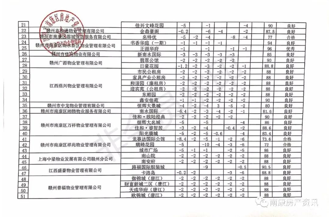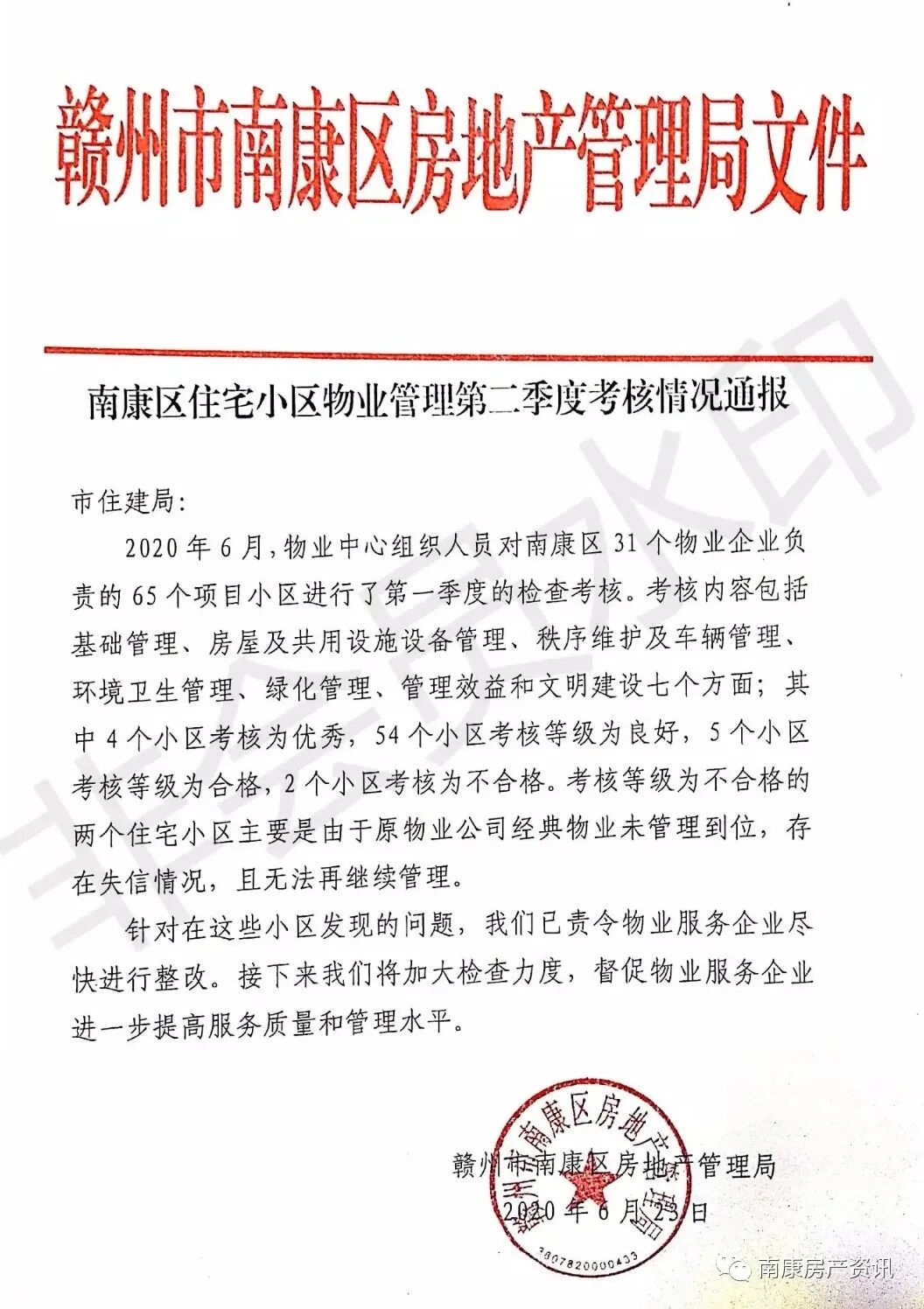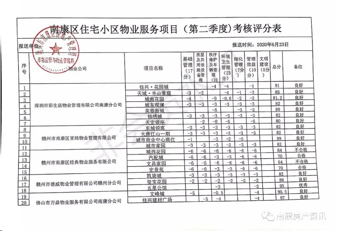 为进一步规范物业服务企业服务行为,提高物业服务水平,优化群众生活居住环境,我市建立了以规范物业服务为核心的常态化监督考核机制,根据《赣州市住宅小区物业管理考核办法(试行)》(赣市建字〔2019〕112 号)的要求,现将二季度各县(市、区)对辖区物业住宅小区项目考核的情况通报如下: