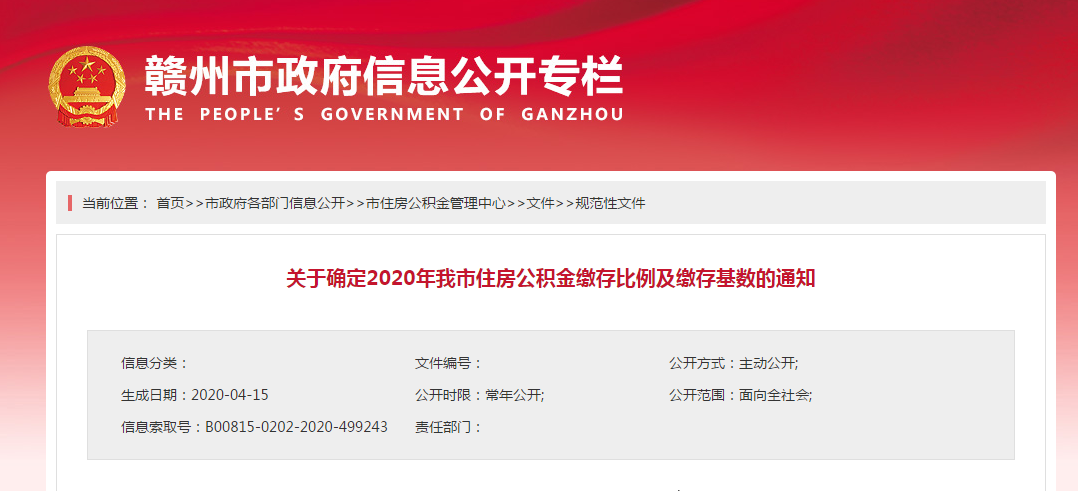 为规范我市住房公积金缴存政策,切实维护职工个人权益,根据赣州市住房公积金管理委员会2020年第一次会议精神,现将2020年我市住房公积金缴存比例及缴存基数有关事项通知如下: 一、住房公积金缴存比例我市行政、事业单位住房公积金缴存比例按单位和个人各为12%执行,其它单位住房公积金缴存比例可根据单位实际情况按单位和个人各为5%至12%执行。二、住房公积金缴存基数及月缴存额上限、下限 1.住房公积金的月缴存基数按上一年度职工月平均工资总额核定(月工资总额按照国家统计部门规定的工资总额计算),但最高不超过本市统计部门公布的上一年度职工月平均工资的3倍,最低缴存基数及缴存额下限按上一年度职工月平均工资的60%确定标准执行。2.我市2020年住房公积金月缴存基数上限为18378 元,月缴存额上限为4410元(含单位、个人两部分,下同)。3.为贯彻落实习近平总书记关于新冠肺炎疫情防控和应对工作的重要指示精神,按照中央、省、市关于出台阶段性、有针对性的政策措施,缓解企业困难的决策部署,2020年暂不提高月缴存基数和月缴存额下限,继续按照2019年的标准执行,即月缴存基数下限为3202元,月缴存额下限为320元。4.城镇个体工商户月缴存住房公积金的工资基数,按照缴存人上一年度月平均纳税收入计算。5.我市辖区内的中央、省属驻市单位住房公积金缴存标准,按我市缴存标准规定执行。6.本通知自2020年1月1日起执行。