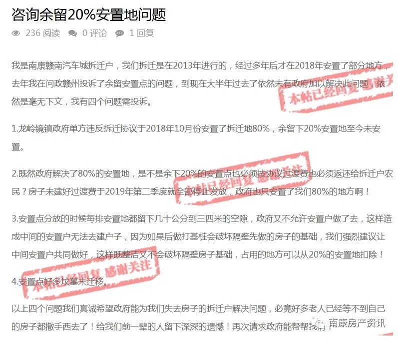 近日,有网友于问政平台留言咨询赣南汽车城拆迁户关于余留下20%安置地至今未安置等相关问题,南康区龙岭镇政府调查核实后作出了回复,一起来看看~