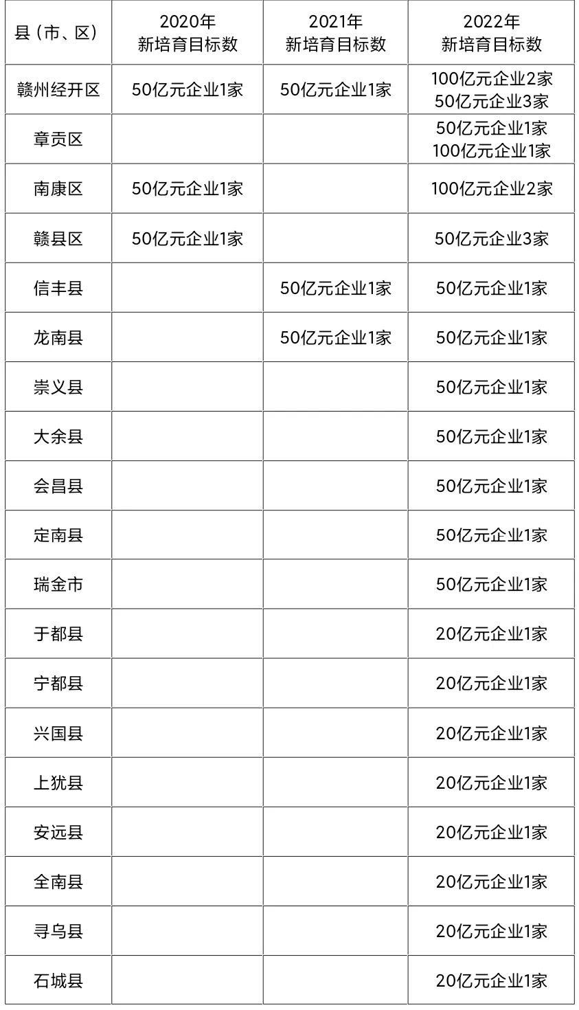 为深入贯彻市委、市政府“主攻工业,三年再翻番”决策部署,全力培育一批营业收入超50亿元、100亿元的大型龙头企业,引领 “两城两谷两带”产业转型升级、做大做强,推动全市工业经济高质量跨越式发展,制定如下政策措施。一、培育对象及目标在“两城两谷两带”及各县(市、区)首位产业中,选择一批龙头骨干企业,以及固定资产投资额大、科技含量高、市场前景好、盈利能力强、近期能竣工投产(或投产时间短,尚未达产达标)的重大项目给予重点支持。根据实际情况,每年适当调整培育企业名单。到2022年,培育形成10家以上营业收入超50亿元企业,其中超百亿元企业2-3家。力争赣州经开区、章贡区和南康区有百亿龙头企业,赣县区、信丰县、龙南县、崇义县、大余县、会昌县、定南县和瑞金市有50亿企业,其它县首位产业均要有20亿元企业。二、扶持政策(一)基金支持市“两城两谷两带”产业基金和市重大工业项目投资引导资金重点支持。对企业实施产业上下游兼并重组、强强联合、引入战略投资者、兼并收购科研机构和企业技术创新资源,收购境外资源、优质资产、优势品牌和营销网络等并购重组类项目,以及固定资产投资额10亿元以上的新建项目、2亿元以上的技改升级项目,符合产业基金投放条件的,可按不高于并购重组资金(或项目固定资产投资总额)30%的比例向企业提供直接股权投资,或按不高于70%的比例向企业提供市重大工业项目投资引导资金。〔牵头单位:赣州发投集团、赣州国投集团、市工信局,责任单位:市政府金融办、市财政局〕(二)财政支持对企业实施的并购重组和重大技改升级项目,由受益财政按年度给予奖励,奖励金额不超过该项目对地方经济贡献。市本级设立扶持龙头企业发展专项资金,在企业并购重组、重大技术改造(智能制造)和规模上台阶等方面予以重点支持。对企业实施并购重组,按企业资产增值额2%给予补助,最高不超过500万元;对企业实施的重大技术改造项目,按当年固定资产投资额一定比例给予奖励;对县(市、区)首位产业内营业收入首次突破20亿元的企业,一次性奖励100万元,首次突破50亿元的企业,一次性奖励300万元,首次突破100亿元的企业,一次性奖励500万元。〔牵头单位:市工信局、各县(市、区)政府、赣州经开区管委会,责任单位:市财政局、市税务局〕(三)金融支持对符合条件、有上市意愿的企业,可随时申报纳入市级上市后备企业库,享受各项扶持政策。企业贷款到期有续贷需求的,银行机构不盲目断贷,政府续贷周转金给予不高于原贷款利率支持,并纳入江西省金融机构支持赣州市实体经济发展产融对接重点服务企业范围。〔牵头单位:市政府金融办,责任单位:市财政局、各县(市、区)政府、赣州经开区管委会〕(四)用地支持积极争取使用省级专项用地指标,对重点培育龙头企业项目用地实现应保尽保。对项目建设所涉及的土地、房屋产权登记给予重点支持。〔牵头单位:市自然资源局、市发改委〕。(五)指标配额支持在市域内兼并重组的,被重组企业原核定的排污、资源开采、加工及出口配额等指标,经市级主管部门批准,按规定更名或过户到重组企业。〔牵头单位:市生态环境局、市自然资源局、市工信局、市商务局,责任单位:各县(市、区)政府、赣州经开区管委会〕(六)集团化支持鼓励支持全市范围内同一控制人企业合并财务报表,实施集团化发展,集团下属控股公司均可享受本政策。对不同县(市、区)企业实施兼并重组或合并财务报表的,被兼并或并表企业数据在全市工业考评中仍保留在企业所在县(市、区);在全市工业考核评比中,实施兼并重组或并表企业数据若达到加分标准的,被兼并或并表企业所在县(市、区)可享受同比例加分。〔牵头单位:市工信局,责任单位:市统计局〕(七)技术人才支持市本级科技、人才、人力资源等各类专项资金,集中向重点培育龙头企业倾斜。〔牵头单位:市科技局、市委人才办、市人社局,责任单位:市财政局〕(八)“一事一议”支持企业实施的重大并购重组或重大投资项目(并购资金或项目固定资产投资达到20亿元以上),可给予“一事一议”政策支持。〔牵头单位:市工信局、市商务局〕三、保障措施(一)建立机制• 市主工办负责建立一个企业、一位市领导、一个部门、一抓到底的“四个一”对接服务机制,切实帮助企业解决发展中的实际问题。市工信局会同相关部门不定期开展企业“坐诊式”服务,宣传政策、加强指导、评估效果。企业所在县(市、区)政府对培育龙头企业工作实行主要领导联系制度,建立相应工作机制,结合实际研究出台配套政策。(二)明确职责