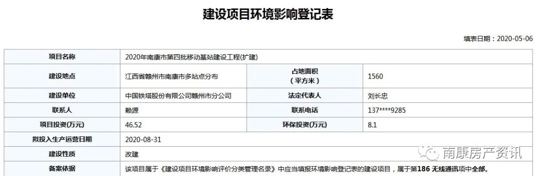 5月6日,2020年南康区第四批移动基站建设工程(扩建)环境影响登记表发布,其中项目投资约46.52万元,一起来看看具体情况~