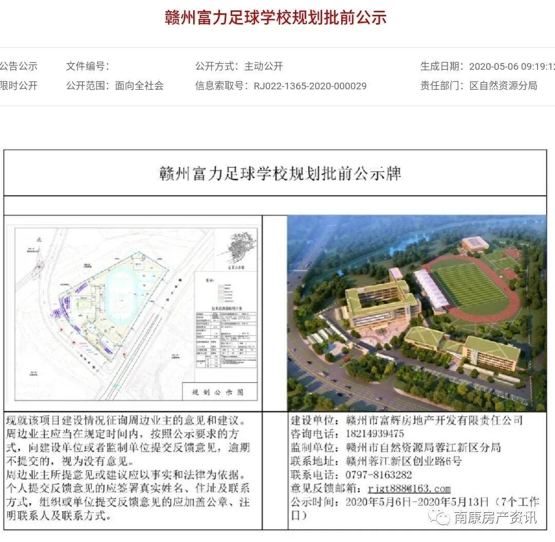 近日,小仙女获悉,赣州市第一所足球学校——赣州富力足球学校发布规划批前公示,效果图公布,建设单位为赣州市富辉房地产开发有限责任公司。