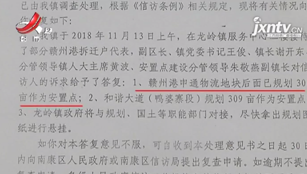 记者了解到,为了安置点的问题,新屋村的村民多次向有关部门反映情况,龙岭镇政府也多次作出信访回复,一会儿说,在赣州港监管区对面的选址被区规划局否决,一会又说,将在赣州港申通物流后面规划300亩土地作为安置点,再后来又说,将在龙岭镇樟桥村附近规划安置点。不过,一直没兑现。