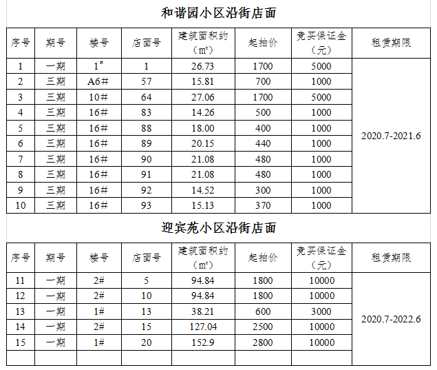 一、标的概况:位于南康区保障性住房迎宾苑小区和南康区东山街办塔垇安置点南侧和谐园(廉租房小区),共15宗店面,租金自第二年起每年递增5%,竞得后,竞得人需缴纳履约保证金,即为相应的竞买保证金金额。各店面情况详见下表:
