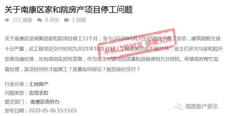 南康区政府办回复:网友:您好,您反映“南康区家和院项目停工”的问题已收悉,经南康区房管局调查处理,现回复如下:一、“工地复工”问题该项目于2020年4月中旬就陆续准备复工的各项工作,本月会陆续复工复产。开发商承诺将在5月21日前答复全面复工进展情况。二、“质量安全”问题区住建局将全程监督检测项目各工种提交的资料及原材料送检,检测合格后方能进行下一步工序施工。三、“交付使用”问题该项目原定高层交付时间为2021年10月31日,因疫情影响,根据相关文件要求,交付时间合理顺延3个月,不计违约责任。故交房日期顺延至2022年1月31日,距离交付日期还有21个月的生产周期,按照项目施工进度表在2022年1月27日可以交付使用。2020年5月11日
