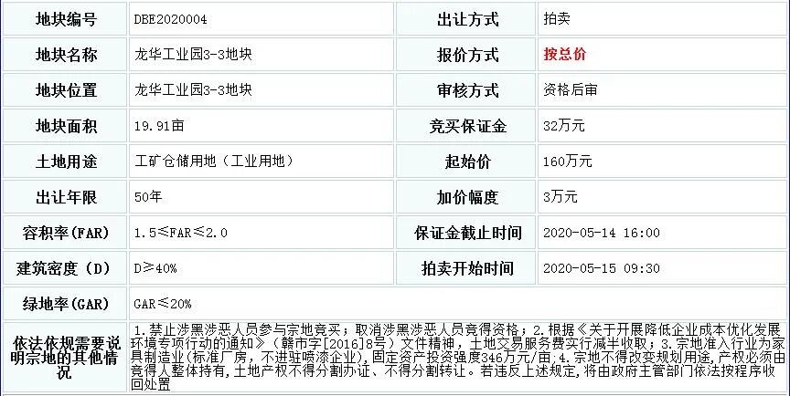 值得注意的是其中还有一项要求:宗地准入行业为家具制造业(标准厂房,不进驻喷漆企业),固定资产投资强度346万元/亩;该宗地不得改变规划用途,土地产权必须由竞得人整体持有,土地产权不得分割办证、不得分割转让。