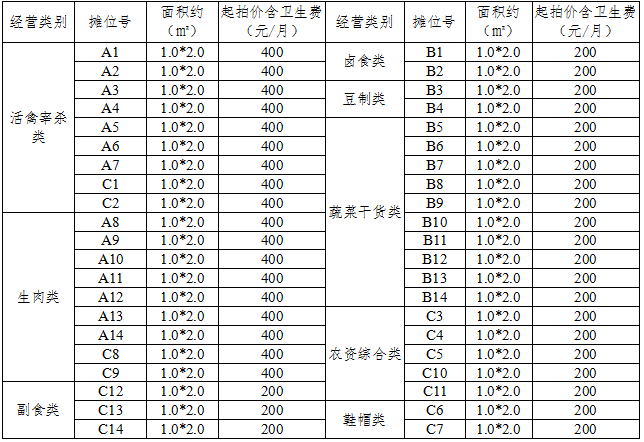 一、标的概况:位于南康区镜坝镇农贸市场共计42宗摊位,经营期限一年(自2020年6月1日至2021年5月31日止),竞买保证金2000元/摊位,起拍价及标的详情见下表。