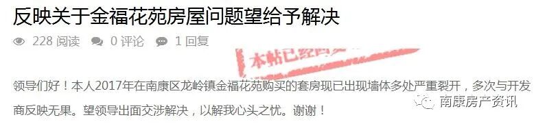 近日,有网友于问政平台留言反映关于金福花苑房屋问题望给予解决,南康区住建局调查核实后进行了回复,一起来看看