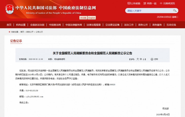 为充分发扬民主,广泛听取意见,接受社会监督,司法部对2020年全国模范人民调解委员会和全国模范人民调解员名单开展公示。公示期至2020年10月13日。公示期内,有关单位和个人可通过信函、传真、电子邮件形式向司法部反映情况。
