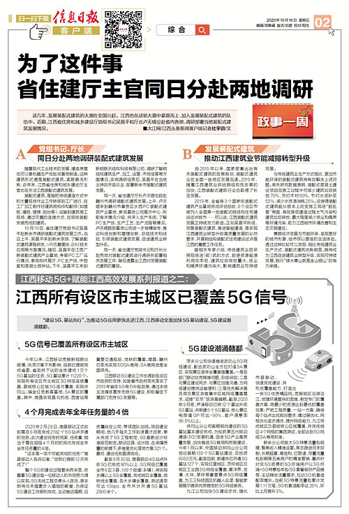 今年以来,江西移动克服新冠肺炎疫情、洪涝灾害不利影响,目前已提前完成省委、省政府下达的全年建成1万个5G基站的任务,5G基站累计11220个。实现所有设区市主城区5G网络连续覆盖、县城核心区域5G连片覆盖,实现井冈山、瑞金红色教育基地、5A景区的覆盖。其中,南昌实现昌北机场、西客站等重要交通枢纽、地铁的覆盖。南昌、赣州已率先实现5GSA商用,SA商用进度全国领先。