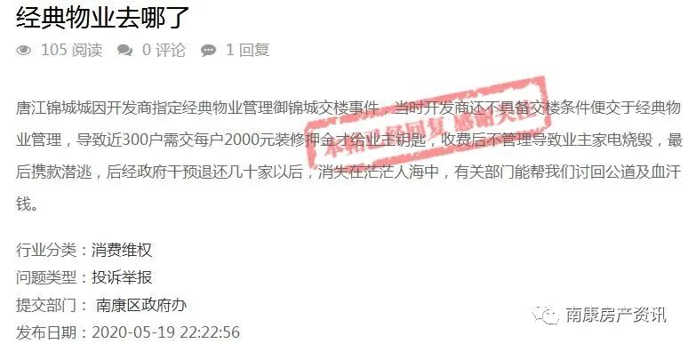 近日,有网友于问政平台留言反映唐江御锦城原物业赣州市南康区经典物业服务有限公司迟迟未退还业主装修押金,现在消失不见希望政府能帮忙。之后南康区房管局调查核实对问题进行了一一回复,一起来看看~