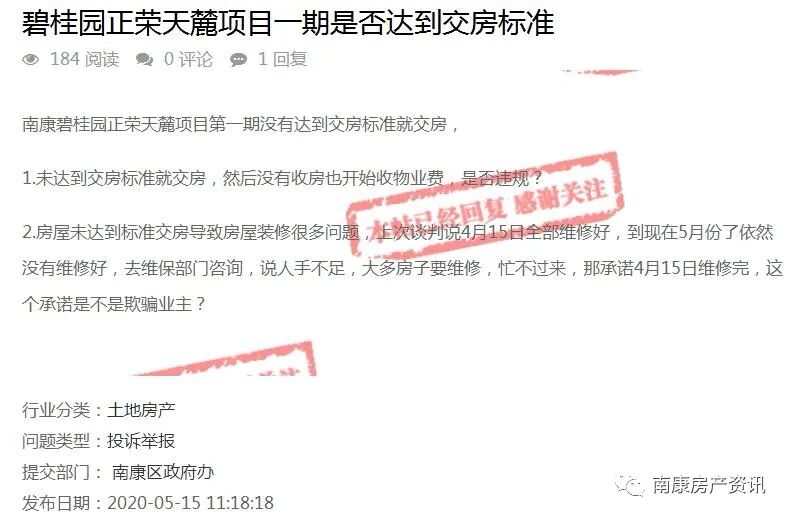 之前,小编在网上看到有挺多网友表达对南康碧桂园房屋质量不满的,近日,有网友于问政平台留言咨询碧桂园正荣天麓项目一期是否达到交房标准,之后南康区房管局对网友的问题进行了回复,一起来看看~