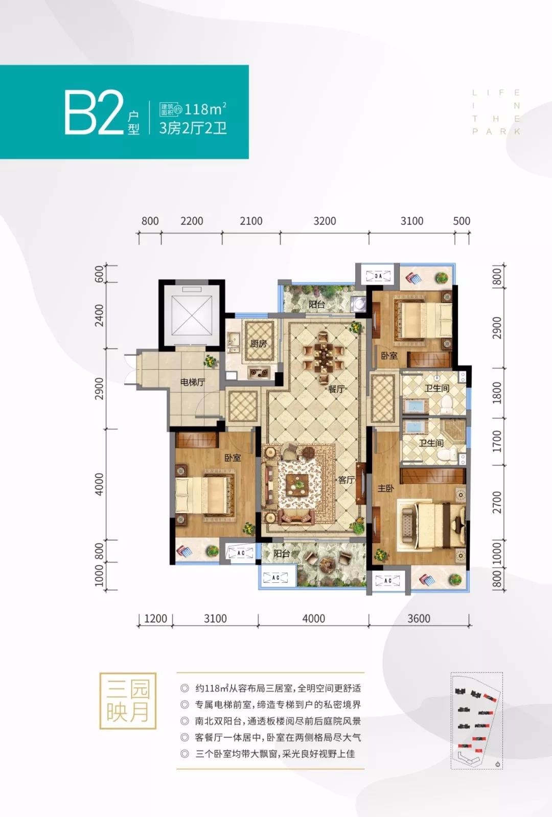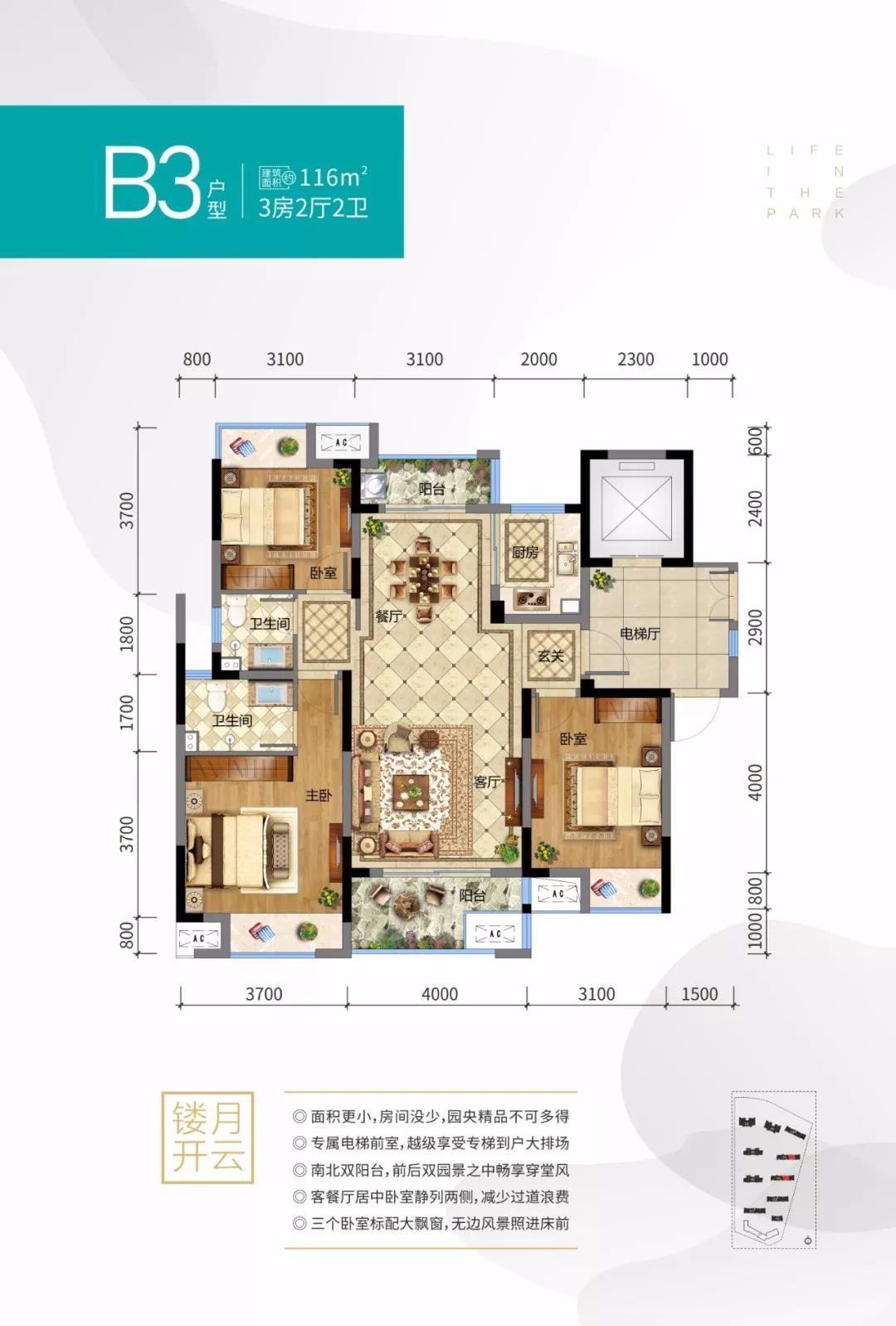 项目容积率2.6,建筑占地率为20%,用地内80%面积为园林和户外活动空间,超3000㎡架空层泛会所,为住户提供遮风避雨的休闲场所